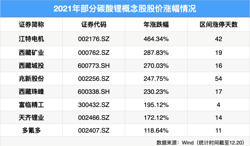 與鋰價一同上漲的還有鋰資源個股股價。Wind數(shù)據(jù)顯示,截至12月20日收盤,10余只概念股年內(nèi)股價已翻倍。江特電機(002176.SZ)累計上漲464.34%,漲幅居首;西藏礦業(yè)(000762.SZ)以287.83%的漲幅次之;西藏珠峰(600338.SH)、兆新股份(002256.SZ)、西藏城投(300432.SZ)等個股漲幅也均在200%以上。