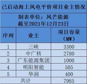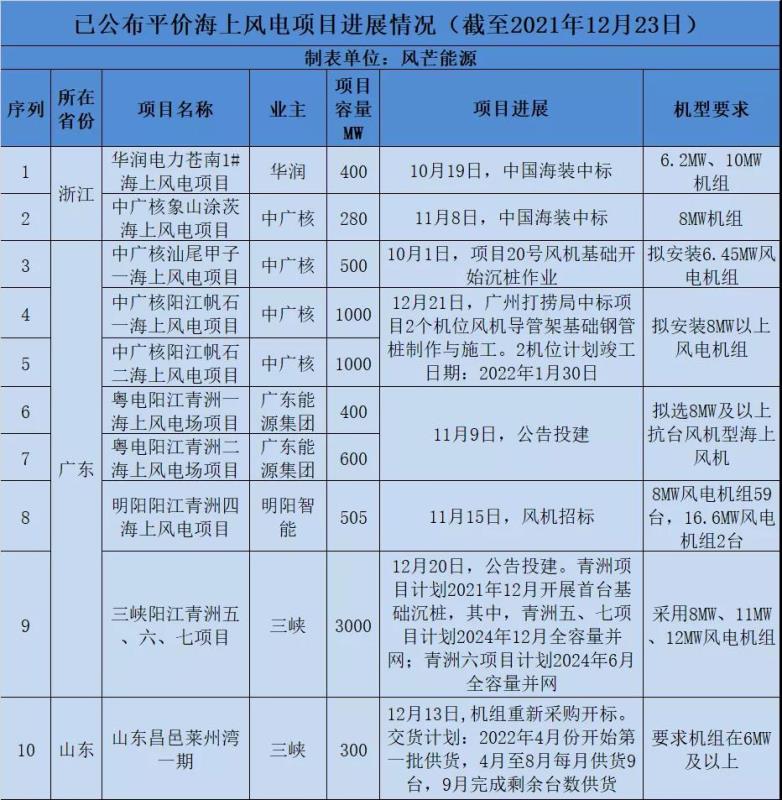 據(jù)風(fēng)芒能源統(tǒng)計(jì),根據(jù)公開新聞,目前已有12個共計(jì)7.985GW海上風(fēng)電平價項(xiàng)目正式啟動。其中,有2個項(xiàng)目已完成機(jī)組中標(biāo)公示;2個項(xiàng)目發(fā)布機(jī)組采購公告;5個項(xiàng)目已宣布要投建;3個項(xiàng)目開始施工。