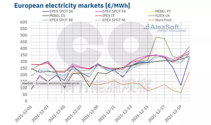 截至12月21日,法國、德國、荷蘭、比利時(shí)、瑞士、奧地利、斯洛文尼亞、克羅地亞、匈牙利、意大利和斯洛伐克的日前市場批發(fā)價(jià)格均超過400歐元/MWh。塞爾維亞、羅馬尼亞的價(jià)格分別為396歐元/MWh和395歐元/MWh。保加利亞和希臘處最低位342歐元/Mwh。