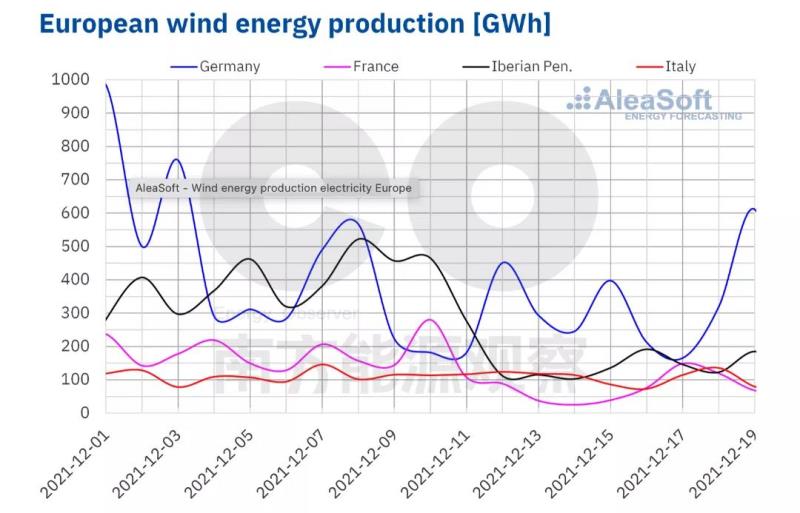 此外,受到冷高壓影響,歐洲風(fēng)電出力水平降低。12月21日,德國風(fēng)電出力降至2277兆瓦,為11月16日以來的最低水平。整體來看,歐洲幾大的風(fēng)電生產(chǎn)國英國、德國和丹麥僅利用了14%的裝機(jī)容量。
