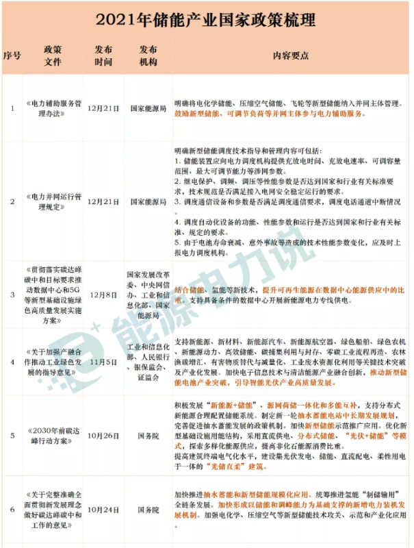 2021年儲(chǔ)能產(chǎn)業(yè)國(guó)家政策匯總?cè)缦卤恚?