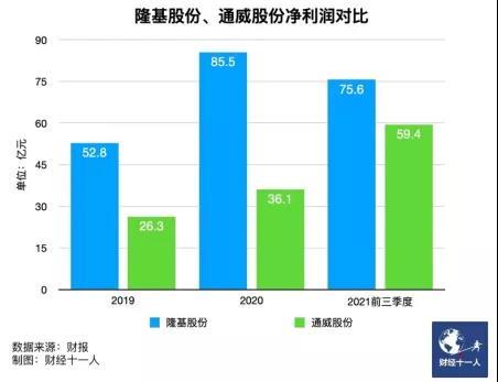 如果說隆基是因?yàn)樽プ×藛尉У某~利潤才成為光伏老大,那么通威股份(600438.SH)眼下也趕上了硅料的超額利潤期,盡管持續(xù)時(shí)間可能并不長。2021年,得益于硅料的高價(jià),通威迅速拉近與隆基的凈利潤差距。2022年硅料價(jià)格依然較高,通威作為龍頭獲利最大,而隆基的硅片利潤進(jìn)一步收縮,通威有可能超越隆基,成為最賺錢的光伏公司。