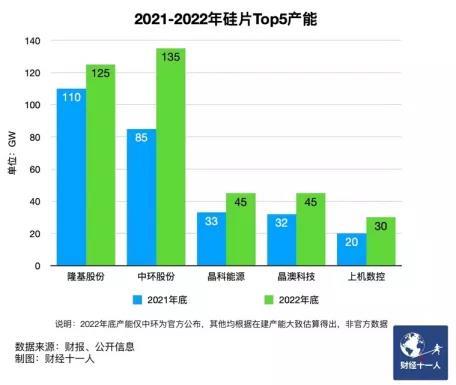 中國光伏行業(yè)協(xié)會(huì)硅業(yè)分會(huì)根據(jù)各主要企業(yè)的規(guī)劃進(jìn)行初步統(tǒng)計(jì),2022年底,國內(nèi)多晶硅產(chǎn)能為85萬噸/年,考慮到海外產(chǎn)能供應(yīng),可滿足230GW的裝機(jī)需求。據(jù)《財(cái)經(jīng)》記者不完全統(tǒng)計(jì)與推算,2022年底僅Top5硅片企業(yè)就將新增約100GW產(chǎn)能,硅片總產(chǎn)能近500GW。