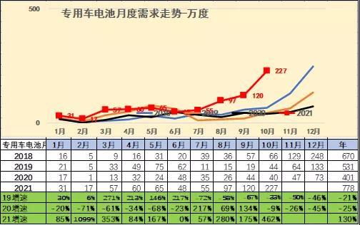 2021年初專用車用電需求增長較猛。10月的專用車電池需求227萬度,較去年同期大幅增長。
