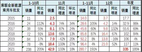 2020年乘用車新能源車銷量達到117萬臺,同比增長11%。2021年11月新能源乘用車批發(fā)銷量達到42.9萬輛,環(huán)比增長17.9%,同比增長133%。1-11月新能源乘用車批發(fā)280.7萬輛,同比增長191%。新能源車與傳統(tǒng)燃油車走勢形成強烈差異化的特征,實現(xiàn)對燃油車市場的替代效應(yīng),并拉動車市加速向新能源化轉(zhuǎn)型的步伐。