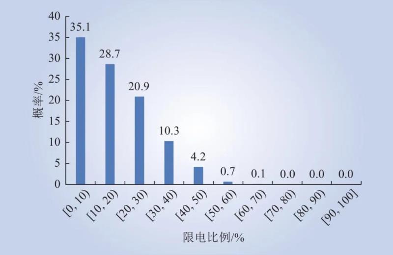 根據(jù)計(jì)算,如果不進(jìn)行電網(wǎng)改造但允許限電,全年8760 h中有764 h存在限電,時(shí)段占比為8.7%;限電量占比為10.04%。不同限電比例的概率如圖1所示。
