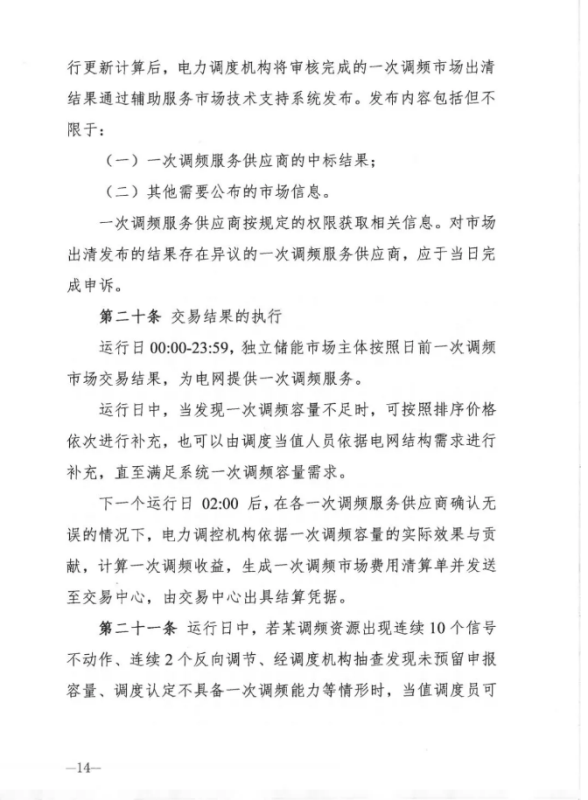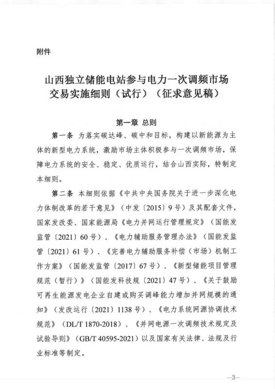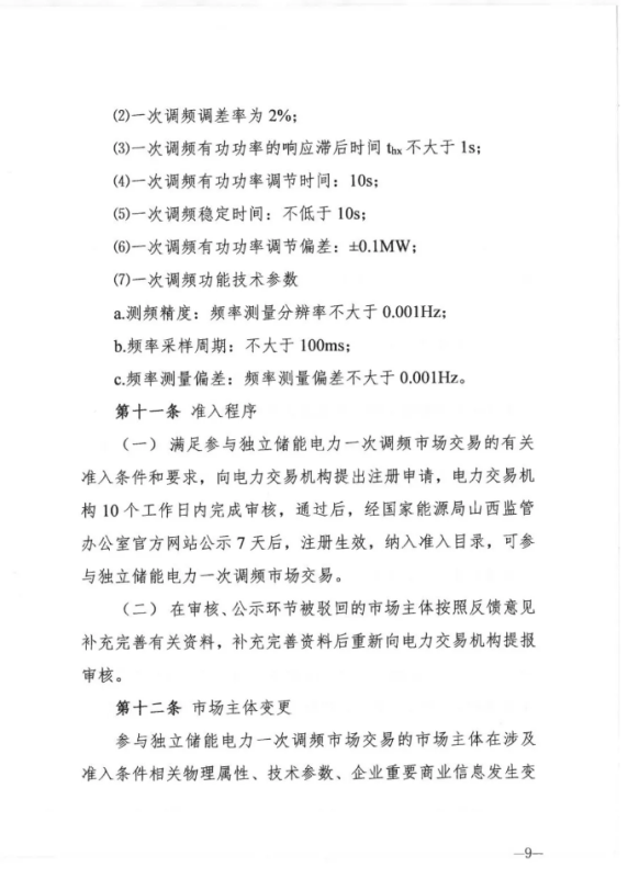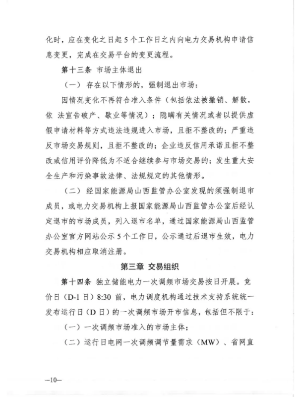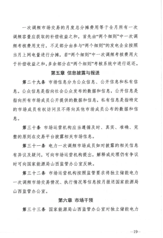 中國儲(chǔ)能網(wǎng)訊:12月30日,山西能源監(jiān)管辦發(fā)布關(guān)于征求《山西獨(dú)立儲(chǔ)能電站參與電力一次調(diào)頻市場(chǎng)交易實(shí)施細(xì)則(試行) 》意見的函,其中關(guān)于交易組織章節(jié)規(guī)定,獨(dú)立儲(chǔ)能電力一次調(diào)頻市場(chǎng)交易按日開展。競價(jià)日(D-1 日) 8: 30 前,電力調(diào)度機(jī)構(gòu)通過技術(shù)支持系統(tǒng)統(tǒng)一 發(fā)布運(yùn)行日(D 日) 的一次調(diào)頻市場(chǎng)開市信息。