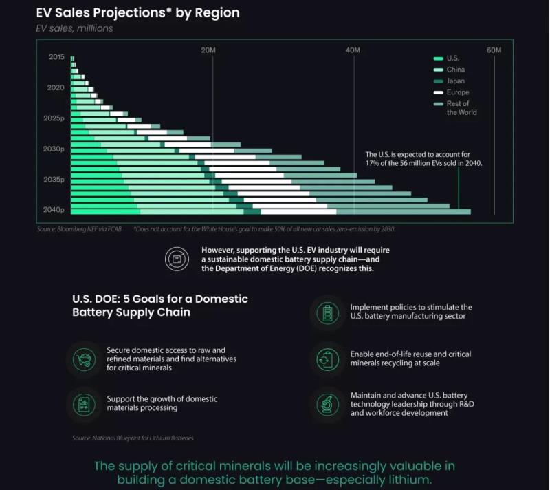 然而,更多的電動(dòng)汽車需要更多的電池,更多的電池需要更多的原材料,尤其是鋰。2020年,電池生產(chǎn)占鋰消費(fèi)量的81%,且需求量不斷增加。據(jù)彭博社報(bào)道,到2030年全球每年可能需要2000 GWh的鋰離子電池,而2020年為223 GWh。鑒于鋰是這些電池的關(guān)鍵成分,對(duì)鋰需求的影響將是巨大的。事實(shí)上,預(yù)計(jì)2025年全球鋰需求將超過供應(yīng)。此外,到2030年,全球?qū)⒂?00家電池巨型工廠開工建設(shè),每年可能需要300萬噸鋰,約為目前產(chǎn)量的37倍。隨著全球電動(dòng)汽車市場(chǎng)的擴(kuò)大,滿足日益增長(zhǎng)的鋰需求將需要新的生產(chǎn)來源。美國(guó)尤其如此,美國(guó)正在努力建立國(guó)內(nèi)電池供應(yīng)鏈,但目前只擁有一個(gè)鋰礦生產(chǎn)基地。