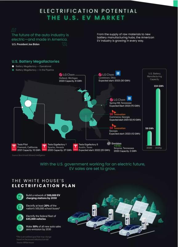 美國(guó)政府也在盡其所能支持電動(dòng)汽車的發(fā)展。最近通過的萬億美元基礎(chǔ)設(shè)施法案支持白宮的電氣化計(jì)劃,其中75億美元用于建設(shè)電動(dòng)汽車充電站網(wǎng)絡(luò),另外50億美元用于低排放和零排放公交車。2021年早些時(shí)候,拜登總統(tǒng)簽署了一項(xiàng)行政命令,目標(biāo)是到2030年使50%的新車銷售是電動(dòng)汽車。