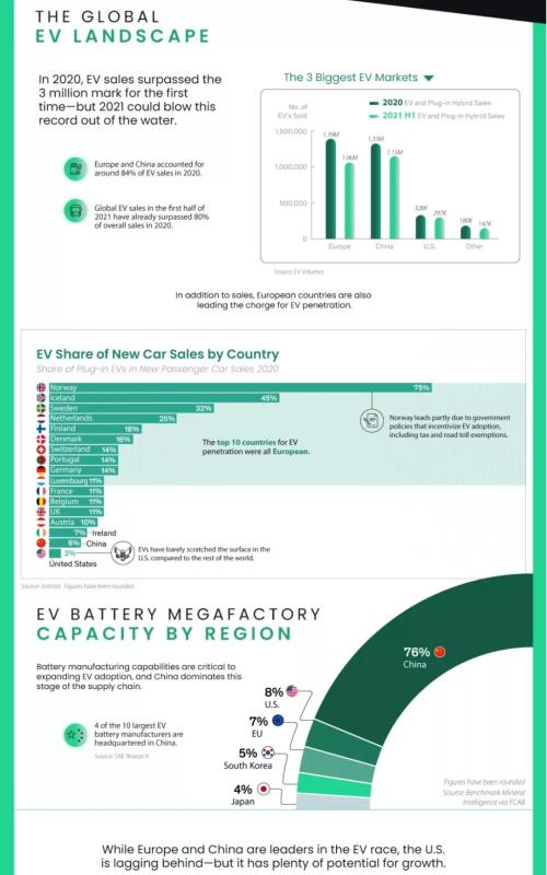2020年全球電動(dòng)汽車和插電式混合動(dòng)力汽車銷量首次突破300萬,而2021年上半年的數(shù)據(jù)表明,2021年可能會(huì)再創(chuàng)歷史新高。歐洲和中國(guó)在這兩年一直是領(lǐng)先的電動(dòng)汽車市場(chǎng),插電式混合動(dòng)力和電池電動(dòng)汽車(BEV)80%以上的銷售都在這兩個(gè)地區(qū)。盡管國(guó)家人口是絕對(duì)銷售潛力的驅(qū)動(dòng)因素,但政府激勵(lì)措施在擴(kuò)大電動(dòng)汽車采用方面起到了關(guān)鍵作用。例如,一些歐洲國(guó)家為購買和擁有電動(dòng)汽車提供稅收優(yōu)惠,此外還有道路通行費(fèi)豁免等激勵(lì)措施,歐洲國(guó)家也在電動(dòng)汽車普及率排行榜上占據(jù)主導(dǎo)地位。2020年電動(dòng)汽車普及率最高的10個(gè)國(guó)家都是歐洲國(guó)家,挪威位居榜首。