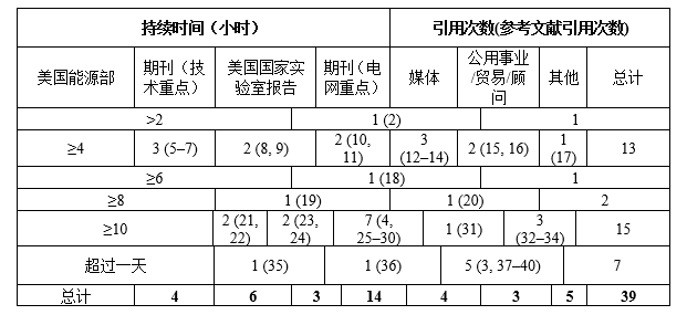 表1提供了對(duì)39份報(bào)告和文獻(xiàn)綜述的總結(jié),這些文件用數(shù)值定義了長(zhǎng)時(shí)儲(chǔ)能持續(xù)時(shí)間,通常以小時(shí)表示。在這時(shí)排除了一些別技術(shù)開(kāi)發(fā)商發(fā)布或推廣的定義,沒(méi)有包含詳細(xì)討論長(zhǎng)時(shí)儲(chǔ)能系統(tǒng)(LDES)但沒(méi)有明確定義持續(xù)時(shí)間的文件。
