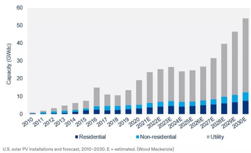 美國的太陽能增長速度驚人且持續(xù)。除了2021年預(yù)計(jì)在美國部署的23吉瓦外,研究機(jī)構(gòu)標(biāo)準(zhǔn)普爾全球市場(chǎng)情報(bào)公司(S& P Global Market Intelligence)還預(yù)測(cè)2022年將有44吉瓦的光伏投入使用,與2021年相比幾乎翻了一番。