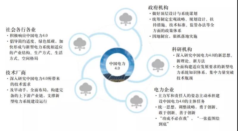 要實(shí)現(xiàn)中國(guó)電力4.0,需要政府、科研機(jī)構(gòu)、電力企業(yè)、技術(shù)廠商以及社會(huì)各行各業(yè)的共同努力(見(jiàn)圖4),共同攜手銳意進(jìn)取。