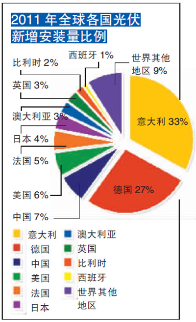 二是全球光伏安裝量大幅上升。受太陽能組件價格大幅度下跌、光伏安裝成本大幅下降的影響,2011年全球光伏安裝量大幅度上升。據(jù)歐洲光伏產(chǎn)業(yè)協(xié)會(EPIA)發(fā)布的最新統(tǒng)計報告顯示,2011年全球光伏發(fā)電安裝量突破27.7GW,同比2010年增長70%,創(chuàng)歷史新高。意大利和德國成為全球新增安裝量最高的國家,占全球市場60%(見圖)。而歐洲繼續(xù)統(tǒng)領(lǐng)全球光伏市場,占全球市場的75%,較2010年下降5%(2010年歐洲占全球市場的80%)。根據(jù)EPIA數(shù)據(jù),意大利、德國、中國、美國、法國和日本在2011年安裝量超過1GW。其中意大利新增并網(wǎng)安裝量為9GW,德國7.5GW,中國2GW,美國1.6GW,法國1.5GW,日本1.1GW,澳大利亞700MW,英國700MW,比利時550MW,西班牙400MW,印度300MW等。2011年全球累計安裝量達67.4GW,較2010年底的39.7GW增長70%。