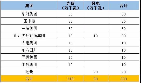 大唐、東方日升、同煤集團(tuán)、中核集團(tuán)各獲得10萬千瓦光伏項(xiàng)目。