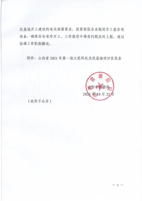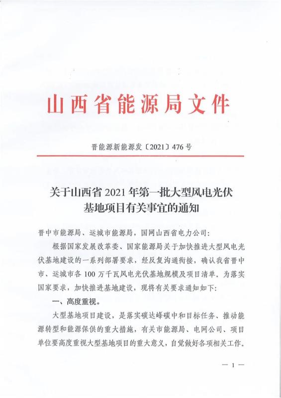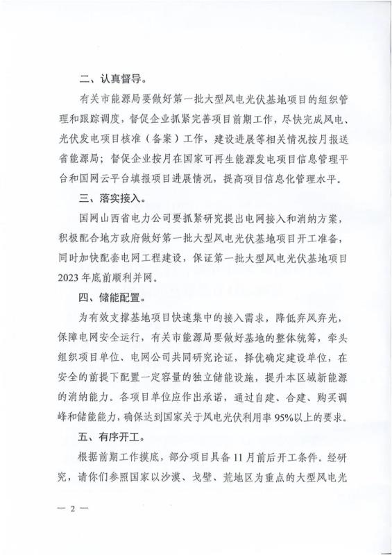 通知要求:國網(wǎng)山西省電力公司要抓緊研究提出電網(wǎng)接入和消納方案, 積極配合地方政府做好第一批大型風(fēng)電光伏基地項(xiàng)目開工準(zhǔn)備,同時(shí)加快配套電網(wǎng)工程建設(shè),保證第一批大型風(fēng)電光伏基地項(xiàng)目 2023年底前順利并網(wǎng)。
