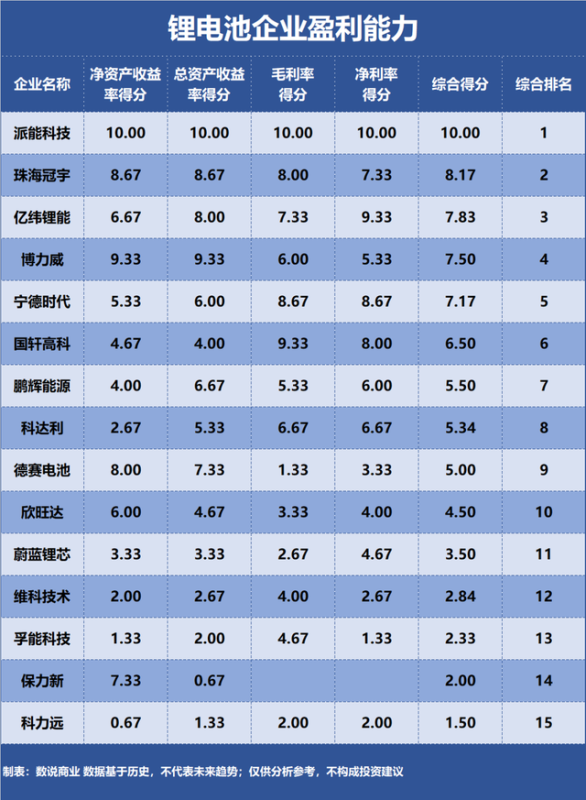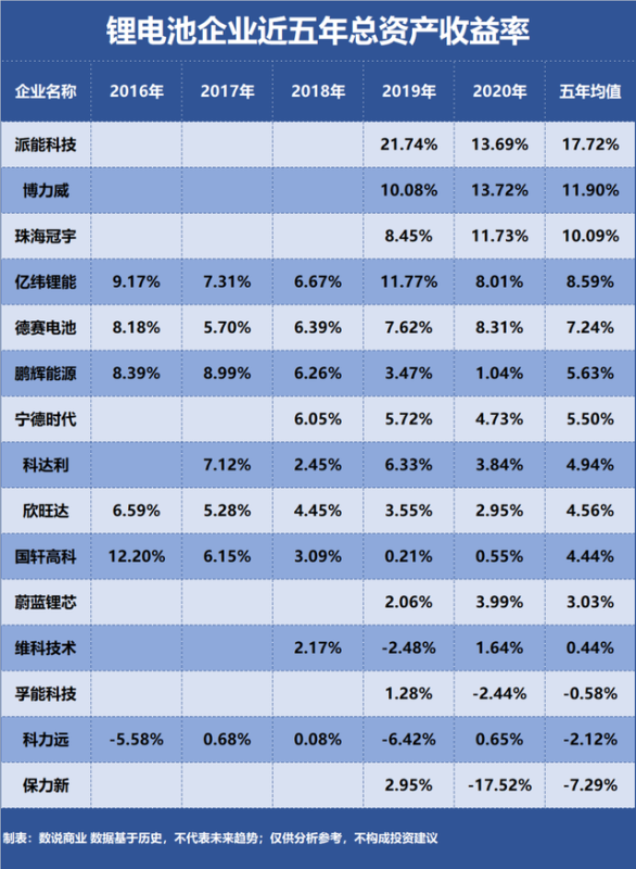 從近五年總資產收益率來看,派能科技、博力威、珠海冠宇等3家企業(yè)超過10%,其中博力威平均總資產收益率達到11.90%。