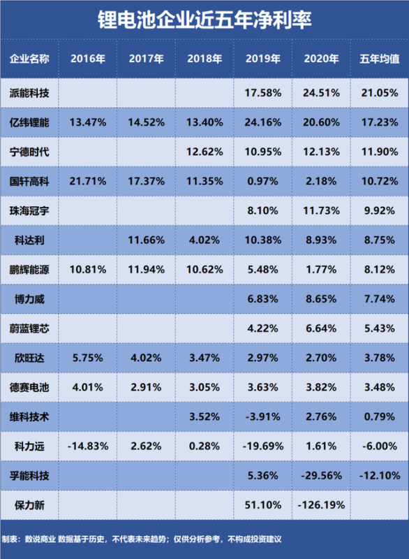 從近五年凈利率來看,派能科技、億緯鋰能、寧德時代、國軒高科等4家企業(yè)超過10%,其中億緯鋰能平均凈利率達到17.23%。