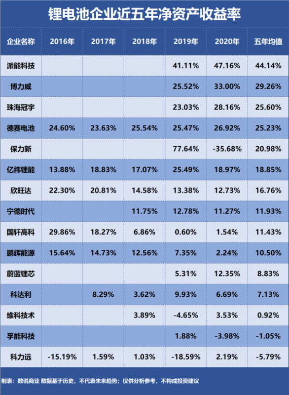 從近五年凈資產收益率來看,派能科技、博力威、珠海冠宇、德賽電池、保力新等5家企業(yè)超過20%,其中派能科技平均凈資產收益率達到44.14%。