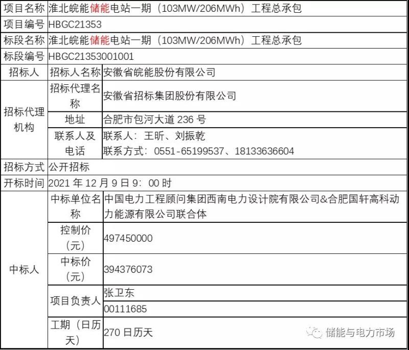淮北皖能儲能電站一期(103MW/206MWh)工程總承包中標結果公示