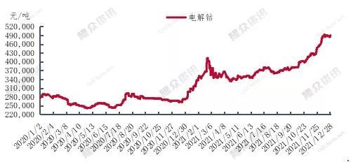 截止12月31日,電解鈷現(xiàn)貨均價48.7萬元/噸,較年初漲21.3萬元/噸,漲幅達(dá)77.74%。2021年全年最高價在496000元/噸,較年初上漲80.36%,全年均價375983元/噸,較去年上漲40.87%。