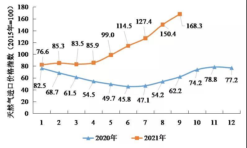 一是傳統(tǒng)能源價格突破歷史紀(jì)錄。整個歐洲方面,被視為歐洲天然氣價格風(fēng)向標(biāo)的荷蘭天然氣期貨價格TTF于2021年10月5日突破了每千立方米1200美元,創(chuàng)下歷史新高。根據(jù)德國聯(lián)邦統(tǒng)計局的數(shù)據(jù),2021年,德國天然氣進(jìn)口價格整體呈上漲趨勢,2020至2021年9月,德國天然氣進(jìn)口價格指數(shù)(該指數(shù)以2015年價格為100)持續(xù)快速上升。2021年9月份天然氣進(jìn)口價格比去年同期上漲171%。
