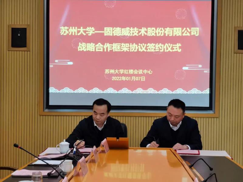 蘇州大學(xué)黨委常委、副校長張曉宏,江蘇蘇大投資有限公司董事長仇國陽,軌道交通學(xué)院黨委書記戴佩良,院長史培新,副院長黃偉國,蘇州大學(xué)-固德威清潔電力協(xié)同創(chuàng)新中心主任楊勇、副主任樊明迪,固德威董事長黃敏、副總裁方剛、研發(fā)中心總監(jiān)向軍,等參加了簽約儀式。儀式由史培新院長主持。