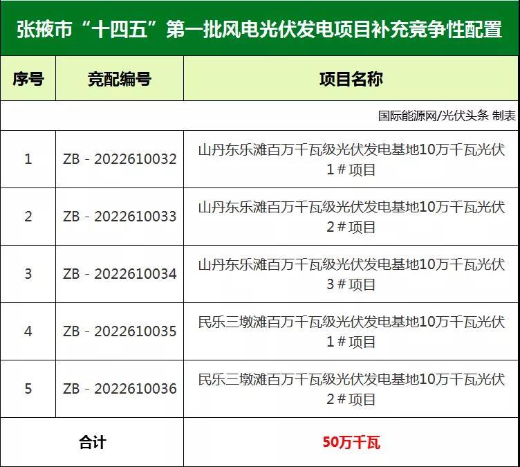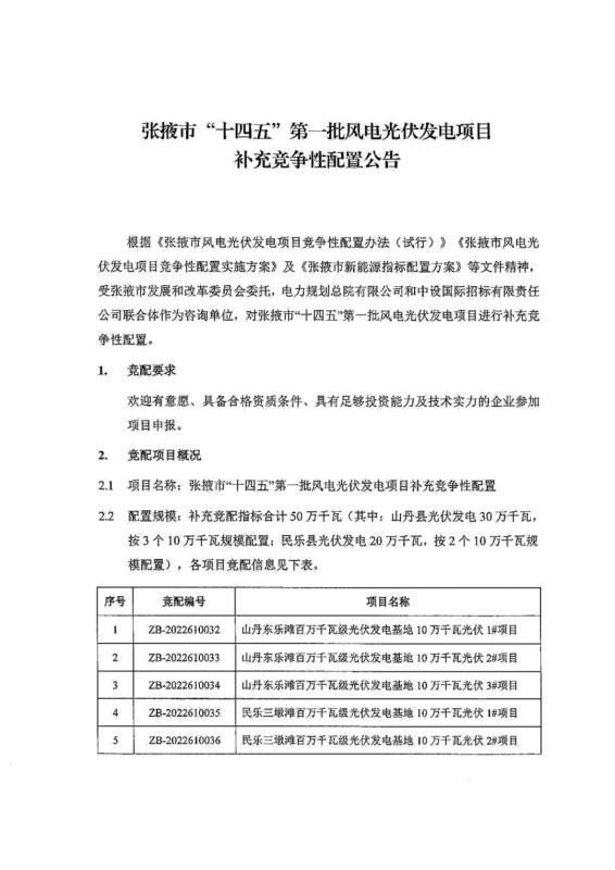 中國(guó)儲(chǔ)能網(wǎng)訊:1月10日,甘肅省張掖市人民政府發(fā)布張掖市“十四五”第一批風(fēng)電光伏發(fā)電項(xiàng)目補(bǔ)充競(jìng)爭(zhēng)性配置公告。根據(jù)公告,配置規(guī)模為:補(bǔ)充競(jìng)配指標(biāo)合計(jì)50萬(wàn)千瓦(其中:山丹縣光伏發(fā)電30萬(wàn)千瓦,按3個(gè)10萬(wàn)千瓦規(guī)模配置;民樂(lè)縣光伏發(fā)電20萬(wàn)千瓦,按2個(gè)10萬(wàn)千瓦規(guī)模配置),各項(xiàng)目競(jìng)配信息見(jiàn)下表。