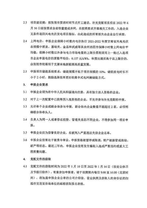 根據(jù)公告,項(xiàng)目建設(shè)期為按張掖市要求時(shí)間節(jié)點(diǎn)開(kāi)工建設(shè),補(bǔ)充競(jìng)配項(xiàng)目應(yīng)在2022年6月30日前按要求全部容量建成并網(wǎng),未按照要求開(kāi)展相關(guān)工作的,入選企業(yè)無(wú)條件退回風(fēng)電光伏發(fā)電項(xiàng)目指標(biāo),由此造成的所有損失由企業(yè)自行承擔(dān)。