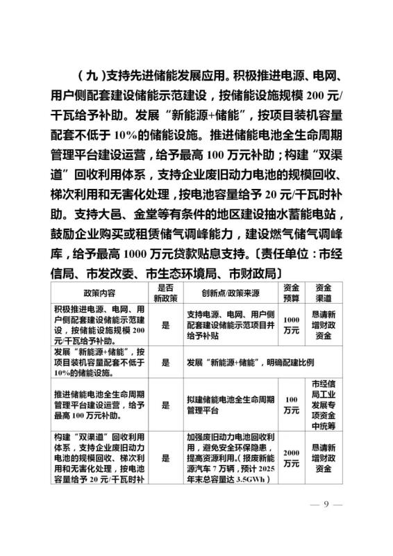 中國儲(chǔ)能網(wǎng)訊:1月6日,成都市經(jīng)濟(jì)和信息化局發(fā)布關(guān)于公開征求《成都市能源結(jié)構(gòu)調(diào)整十條政策措施》意見建議的通知。建議指出支持先進(jìn)儲(chǔ)能發(fā)展應(yīng)用。積極推進(jìn)電源、電網(wǎng)、用戶側(cè)配套建設(shè)儲(chǔ)能示范建設(shè),按儲(chǔ)能設(shè)施規(guī)模200元/千瓦給予補(bǔ)助。發(fā)展“新能源+儲(chǔ)能”,按項(xiàng)目裝機(jī)容量配套不低于10%的儲(chǔ)能設(shè)施。推進(jìn)儲(chǔ)能電池全生命周期管理平臺(tái)建設(shè)運(yùn)營,給予最高100萬元補(bǔ)助;構(gòu)建“雙渠道”回收利用體系,支持企業(yè)廢舊動(dòng)力電池的規(guī)?;厥铡⑻荽卫煤蜔o害化處理,按電池容量給予20元/千瓦時(shí)補(bǔ)助。支持大邑、金堂等有條件的地區(qū)建設(shè)抽水蓄能電站,鼓勵(lì)企業(yè)購買或租賃儲(chǔ)氣調(diào)峰能力,建設(shè)燃?xì)鈨?chǔ)氣調(diào)峰庫,給予最高1000萬元貸款貼息支持。
