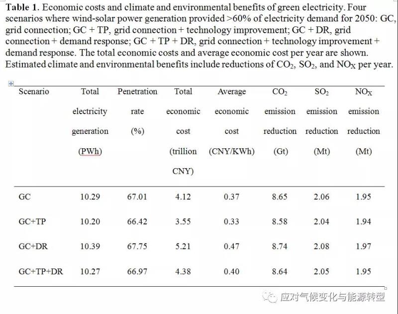 表1、風(fēng)光綠色電力帶來(lái)的經(jīng)濟(jì)成本和氣候環(huán)境指標(biāo)的差異
