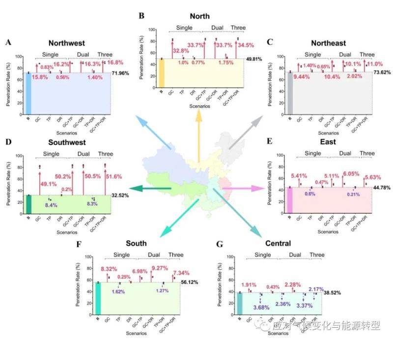 接下來(lái),研究考慮了三種促進(jìn)風(fēng)能-太陽(yáng)能利用的策略(即區(qū)域電網(wǎng)互聯(lián)、技術(shù)進(jìn)步和需求響應(yīng)),并量化了它們對(duì)風(fēng)能-太陽(yáng)能滲透率的潛在影響。區(qū)域電網(wǎng)互聯(lián)情景意味著,模型考慮連接區(qū)域電網(wǎng)(如西北電網(wǎng))內(nèi)的省域電網(wǎng),并在區(qū)域電網(wǎng)尺度上進(jìn)行空間優(yōu)化和模型求解;就技術(shù)進(jìn)步情景而言,我們提高風(fēng)機(jī)輪轂高度,即使用140m高度的風(fēng)機(jī)替代100m高度的風(fēng)機(jī);同時(shí),采用跟蹤式光伏支架替代固定式光伏支架。已有研究表明,與固定式光伏支架相比,采用跟蹤式光伏支架,可以提高20%-40%的光伏發(fā)電量。就需求響應(yīng)情景而言,我們?cè)谛枨髠?cè)調(diào)整負(fù)荷曲線,使其更好地與新能源供給曲線相匹配。具體地,我們將需求響應(yīng)的潛力設(shè)為10%。我們?cè)u(píng)估了每種策略的影響,以及多種策略組合的綜合影響,共計(jì)8種情景。