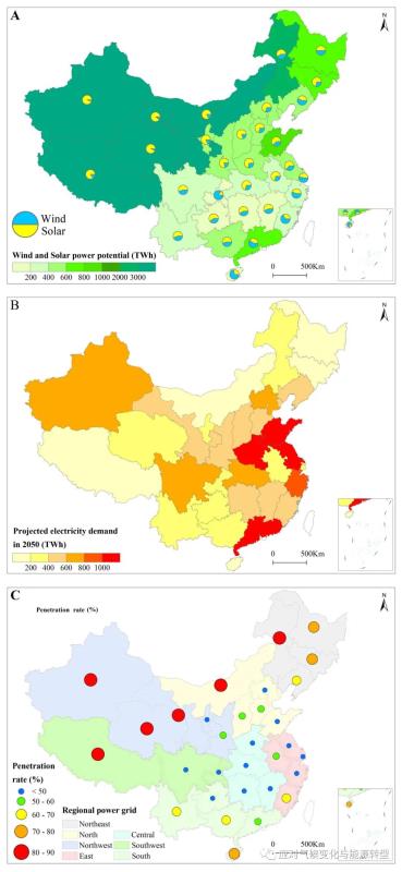 圖1、中國(guó)風(fēng)電光伏發(fā)電潛力、2050年各省用電需求以及2050年中國(guó)不同省份的風(fēng)光滲透率