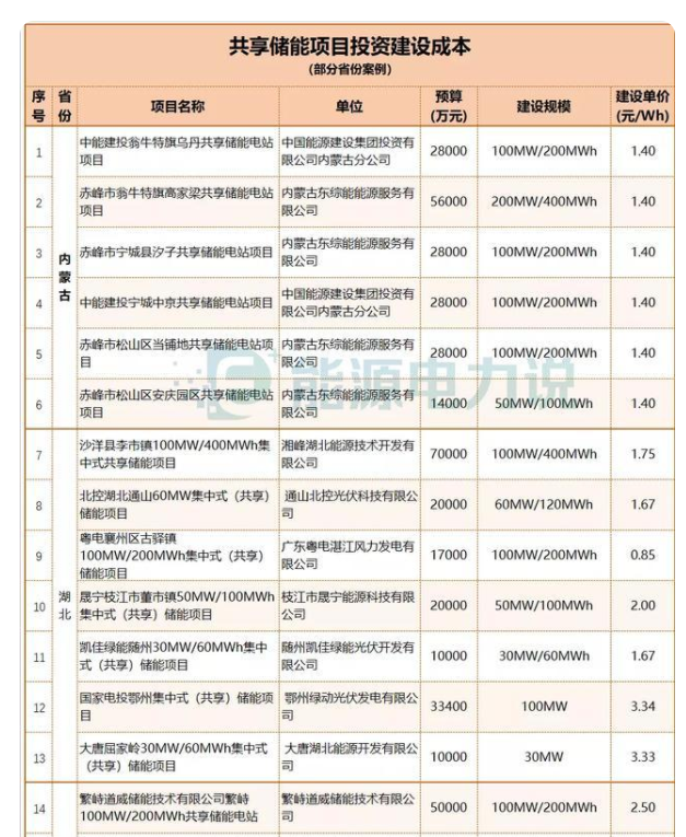 各省備案的共享儲(chǔ)能項(xiàng)目中,單個(gè)項(xiàng)目的容量規(guī)模在100MWh-400MWh之間,能源電力說(shuō)選取了內(nèi)蒙古、湖北、山西3省部分項(xiàng)目來(lái)看看共享儲(chǔ)能的建設(shè)成本。內(nèi)蒙古6個(gè)共享儲(chǔ)能項(xiàng)目建設(shè)單價(jià)是1.4元/Wh,湖北7個(gè)項(xiàng)目單價(jià)區(qū)間較大,山西省14個(gè)項(xiàng)目單價(jià)區(qū)間0.98~2.5元/Wh。