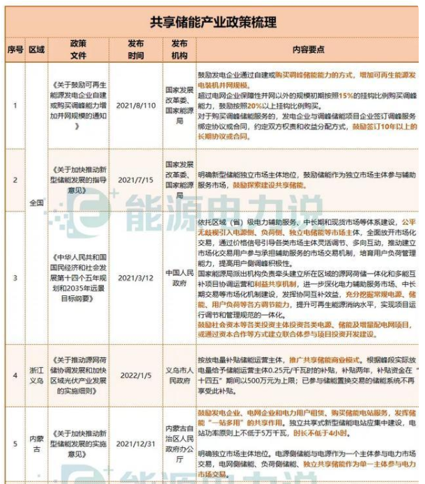 2021年以來(lái),國(guó)家“十四五”綱要規(guī)劃、《關(guān)于加快推動(dòng)新型儲(chǔ)能發(fā)展的指導(dǎo)意見(jiàn)》、《關(guān)于鼓勵(lì)可再生能源發(fā)電企業(yè)自建或購(gòu)買(mǎi)調(diào)峰能力增加并網(wǎng)規(guī)模的通知》等國(guó)家政策均有明確鼓勵(lì)探索建設(shè)共享儲(chǔ)能;其中國(guó)家”十四五“規(guī)劃更是提出:鼓勵(lì)社會(huì)資本等各類投資主體投資各類電源、儲(chǔ)能及增量配電網(wǎng)項(xiàng)目,或通過(guò)資本合作等方式建立聯(lián)合體參與項(xiàng)目投資開(kāi)發(fā)建設(shè)。