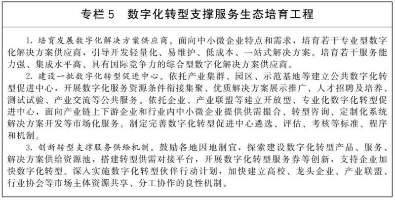 (四)培育轉(zhuǎn)型支撐服務(wù)生態(tài)。建立市場化服務(wù)與公共服務(wù)雙輪驅(qū)動,技術(shù)、資本、人才、數(shù)據(jù)等多要素支撐的數(shù)字化轉(zhuǎn)型服務(wù)生態(tài),解決企業(yè)“不會轉(zhuǎn)”、“不能轉(zhuǎn)”、“不敢轉(zhuǎn)”的難題。面向重點行業(yè)和企業(yè)轉(zhuǎn)型需求,培育推廣一批數(shù)字化解決方案。聚焦轉(zhuǎn)型咨詢、標(biāo)準(zhǔn)制定、測試評估等方向,培育一批第三方專業(yè)化服務(wù)機構(gòu),提升數(shù)字化轉(zhuǎn)型服務(wù)市場規(guī)模和活力。支持高校、龍頭企業(yè)、行業(yè)協(xié)會等加強協(xié)同,建設(shè)綜合測試驗證環(huán)境,加強產(chǎn)業(yè)共性解決方案供給。建設(shè)數(shù)字化轉(zhuǎn)型促進(jìn)中心,銜接集聚各類資源條件,提供數(shù)字化轉(zhuǎn)型公共服務(wù),打造區(qū)域產(chǎn)業(yè)數(shù)字化創(chuàng)新綜合體,帶動傳統(tǒng)產(chǎn)業(yè)數(shù)字化轉(zhuǎn)型。