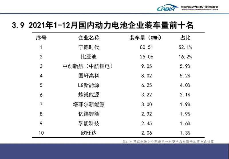 2021年1-12月國內(nèi)動力電池企業(yè)裝車量TOP10的企業(yè)分別是:寧德時代、比亞迪、中創(chuàng)新航、國軒高科、LG新能源、蜂巢能源、塔菲爾新能源、億緯鋰能、孚能科技、欣旺達(dá)。