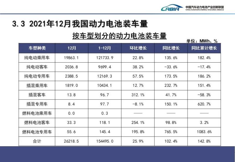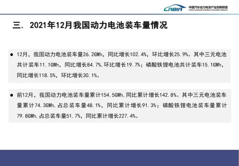2021年1-12月,我國動力電池裝車量累計154.5GWh,同比累計增長142.8%。其中三元電池裝車量累計74.3GWh,占總裝車量48.1%,同比累計增長91.3%;磷酸鐵鋰電池裝車量累計79.8GWh,占總裝車量51.7%,同比累計增長227.4%。