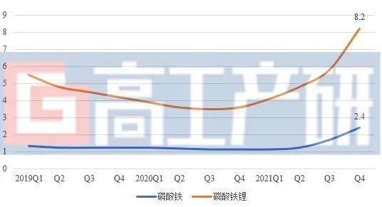 2019-2021磷酸鐵鋰正極材料及磷酸鐵季度價(jià)格走勢(shì)圖(萬元/噸)