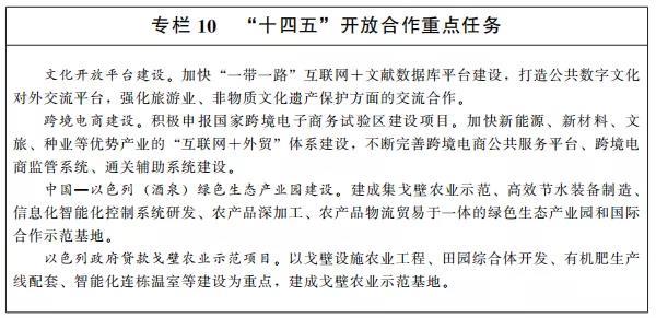 共建國(guó)際合作產(chǎn)業(yè)園區(qū)。依托大型骨干企業(yè)、高新技術(shù)開發(fā)區(qū)、高新技術(shù)產(chǎn)業(yè)園區(qū),強(qiáng)化國(guó)際產(chǎn)業(yè)合作,共建國(guó)際合作產(chǎn)業(yè)園。以節(jié)水設(shè)備制造、戈壁農(nóng)業(yè)開發(fā)、優(yōu)質(zhì)農(nóng)產(chǎn)品生產(chǎn)為重點(diǎn),加強(qiáng)與以色列的全方位合作,推進(jìn)中以(酒泉)綠色生態(tài)產(chǎn)業(yè)園建設(shè)。支持相關(guān)企業(yè)在中亞、西亞、非洲、中東歐等地區(qū)建立境外合作產(chǎn)業(yè)園、科研中心,打造高水平海外產(chǎn)業(yè)創(chuàng)新服務(wù)綜合體。