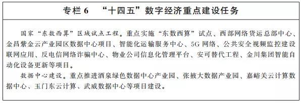 推動(dòng)數(shù)字產(chǎn)業(yè)化。搶抓數(shù)字經(jīng)濟(jì)發(fā)展機(jī)遇,積極服務(wù)“東數(shù)西算”,爭(zhēng)取與上海、深圳等地區(qū)合作,努力打造絲綢之路經(jīng)濟(jì)帶區(qū)域信息匯集中心和大數(shù)據(jù)產(chǎn)業(yè)高地。按照全國(guó)一體化大數(shù)據(jù)中心協(xié)同創(chuàng)新體系要求,將張掖、金昌、酒泉等打造成支點(diǎn)性數(shù)據(jù)中心。