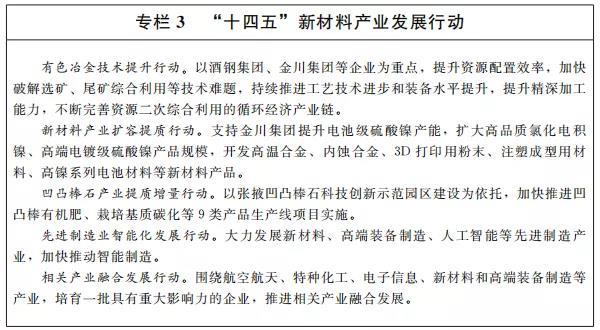 打造有色金屬新材料產(chǎn)業(yè)鏈。以金昌、嘉峪關(guān)為龍頭,協(xié)同建設(shè)有色金屬新材料產(chǎn)業(yè)基地。大力推進(jìn)延鏈補(bǔ)鏈,重點(diǎn)建設(shè)電池、粉末冶金、電鍍、電工材料、鎳合金加工材料產(chǎn)業(yè)鏈。加快發(fā)展高溫合金、耐蝕合金、特種不銹鋼、高鎳系列電池材料、鎳鈷合金、電鍍材料等高附加值產(chǎn)品。加快鍛造產(chǎn)業(yè)鏈供應(yīng)鏈長(zhǎng)板,全面助推冶金—循環(huán)經(jīng)濟(jì)—裝備制造、光伏發(fā)電—電解鋁—鋁制品產(chǎn)業(yè)鏈發(fā)展。