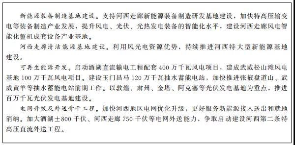 國(guó)家新能源產(chǎn)業(yè)基地。積極打造河西走廊國(guó)家新能源綜合示范區(qū),建設(shè)我國(guó)重要的新能源綜合利用基地、新能源生產(chǎn)和全產(chǎn)業(yè)鏈基地、新能源科技進(jìn)步和體制機(jī)制創(chuàng)新基地。