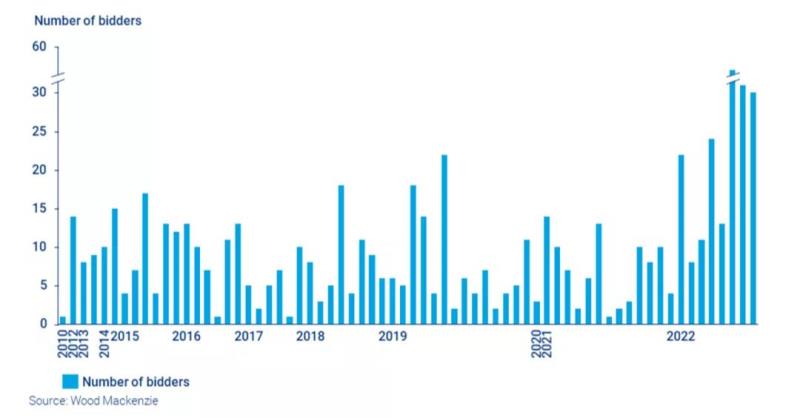 圖表:海上風電招標項目及租賃區(qū)域項目的競標企業(yè)數(shù)量統(tǒng)計
