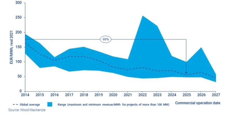 在海上風電連續(xù)六年以“項目中標價格持續(xù)創(chuàng)新低”霸屏后,全新的記錄又產(chǎn)生了。以歐元為單位,2021年投運的海上風電項目,其每兆瓦時項目收益較2014年平均水平下降了55%。根據(jù)最近的中標情況及伍德麥肯茲電價預測,2025年海上風電項目每兆瓦時收益將較2021年再度降低25%。*
