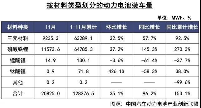 就在大家以為磷酸鐵鋰日薄西山的時候,它卻突然在2021年迎來了逆襲。根據(jù)中國汽車動力電池產(chǎn)業(yè)創(chuàng)新聯(lián)盟的數(shù)據(jù),2021年1—11月,磷酸鐵鋰電池累計(jì)裝車量是64.8GWh,占到總裝車量的50.5%,超越了三元鋰電池。