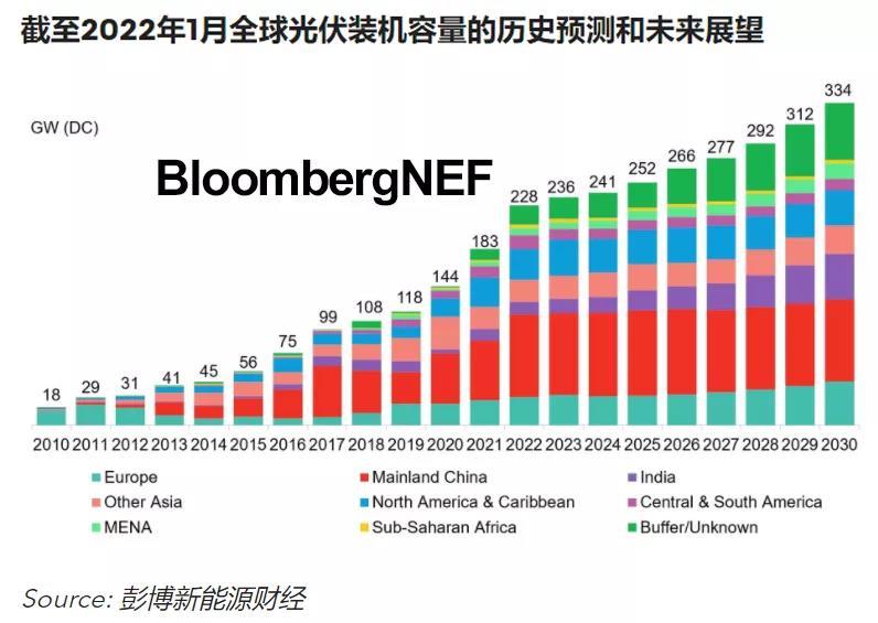 我們預計2022年將成為新建光伏裝機容量超過200GW的第一年,除非在媒體報道披露各國2021年裝機容量數(shù)據(jù)后該年份實際總量已超出這一數(shù)值。