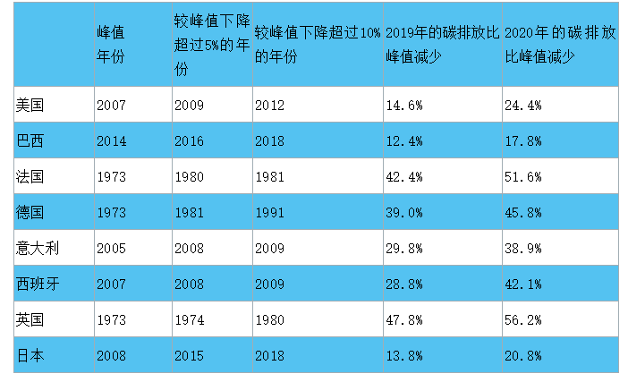 在碳達(dá)峰后直至2019年,多數(shù)典型國家平均每年碳排放減少量為峰值排放量的1%左右。法國、德國、英國在1973年碳達(dá)峰,到2019年碳排放水平較峰值下降約40%-50%。美國、日本在2007年、2008年碳達(dá)峰,至2019年碳排放較峰值下降14%左右。上述國家達(dá)峰后年平均排放降幅約為峰值排放量的1%左右。意大利、西班牙、巴西碳達(dá)峰后排放量降幅較快,達(dá)峰后至2019年年平均降幅為峰值排放量的2%左右。