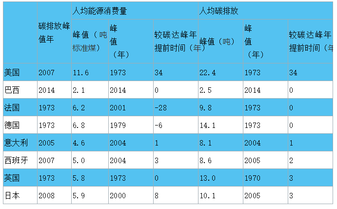 表3 典型國家碳達(dá)峰時(shí)人均能源消費(fèi)量與人均碳排放量