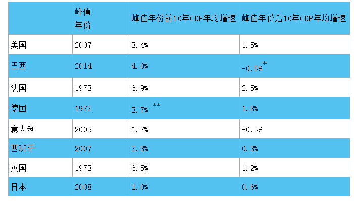 注:*巴西達(dá)峰年份晚,使用的是峰值年份后5年GDP年均增速。**由于數(shù)據(jù)原因,德國使用的是峰值年份前2年GDP年均增速。